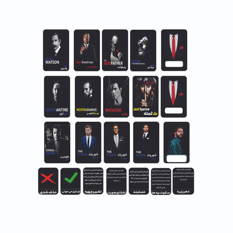 کارت های بازی سناریو گادفادر یا پدرخوانده به همراه کارت های اضافه بدون نقش و همچنین جک گنجکشه که برای سناریو جدید پدر خوانده است مجموعه 22 عددی کارت مقوایی سلفون دار ذو طرفه مات بسیار زیبا و شکیل می باشد . 15 عدد کارت نقش و 7 عدد کارت قرعه مرگ و کارت خروج دارد .