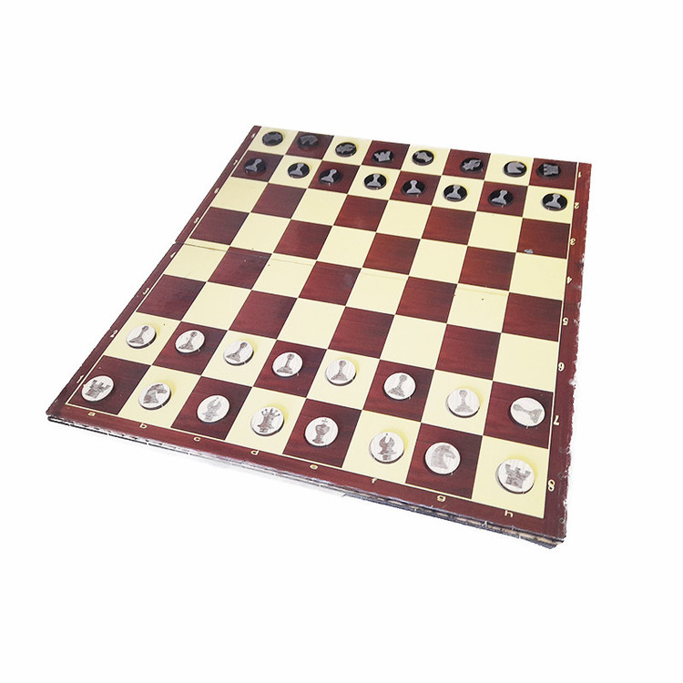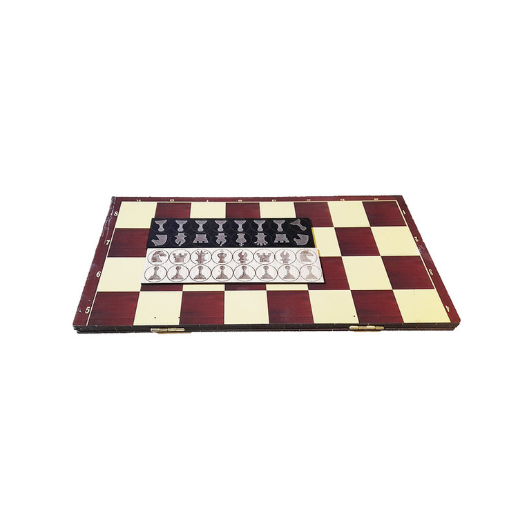 مجموعه بازی چوبی شطرنج تاشو به همراه مهره ها بازی و دو عدد تاس شیشه ای حهت بازی های مختلف است . دارای لولا فلزی و چفت آهنربایی قویی و یک عدد کیف چرمی بازی است
